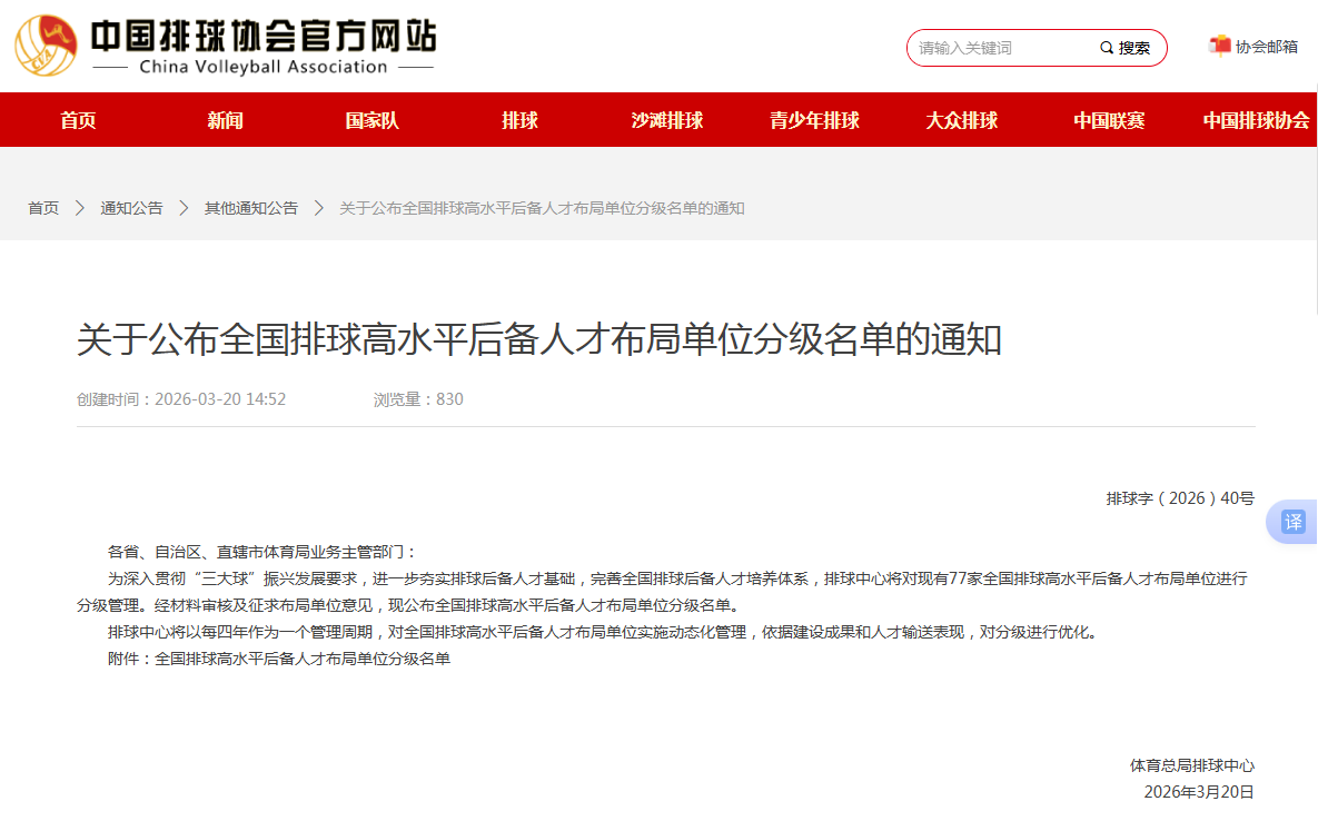 近日,国家体育总局排球运动管理中心正式发布《关于公布全国排球高水平后备人才布局单位分级名单的通知》(排球字〔2026〕40号)。南京市中山东路体育运动学校成功获选,并被评定为最高等级的A级布局单位。在全国入选的77家单位中,A级单位仅27家,标志着学校在排球后备人才培养方面迈入了新阶段。